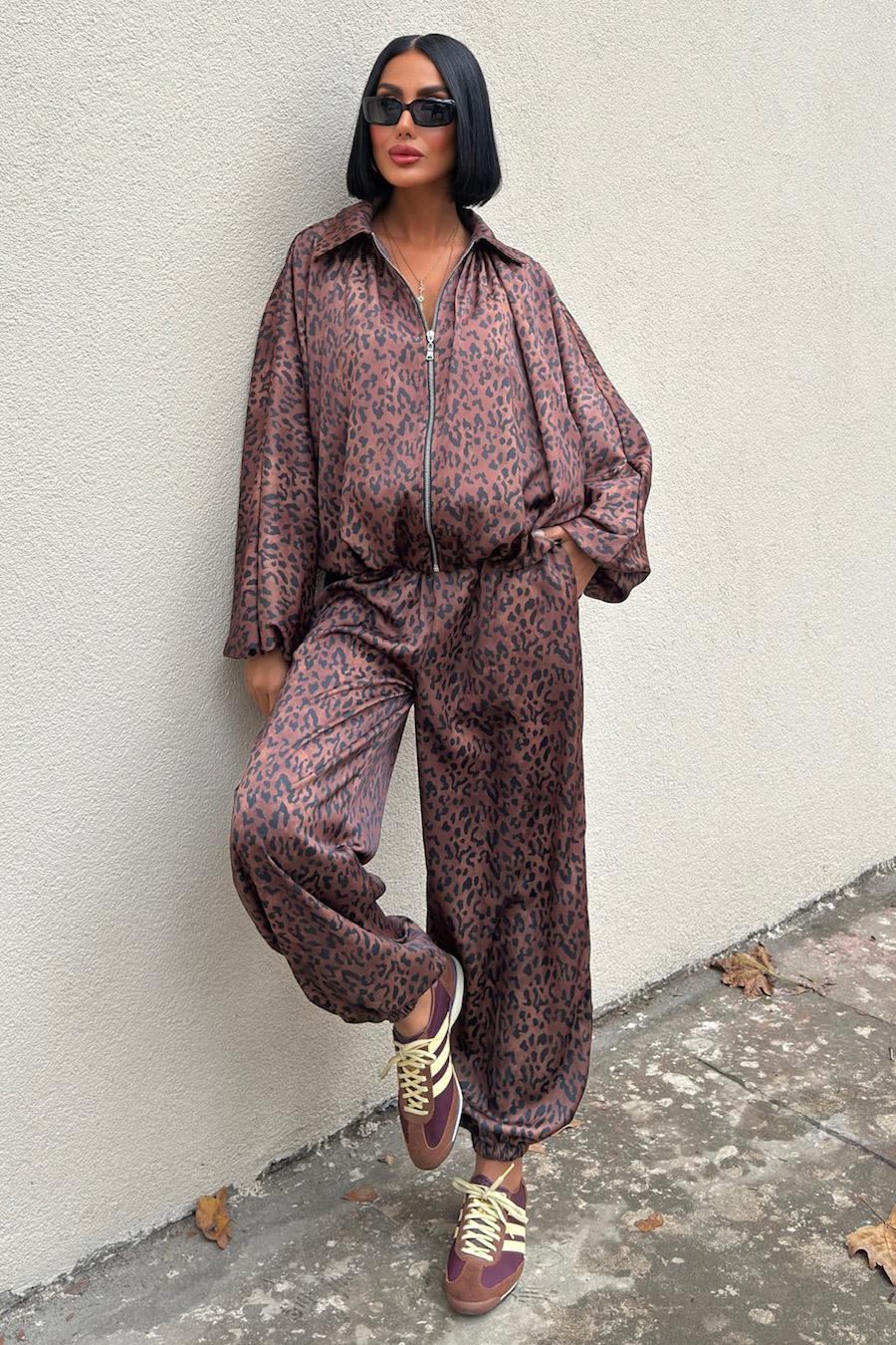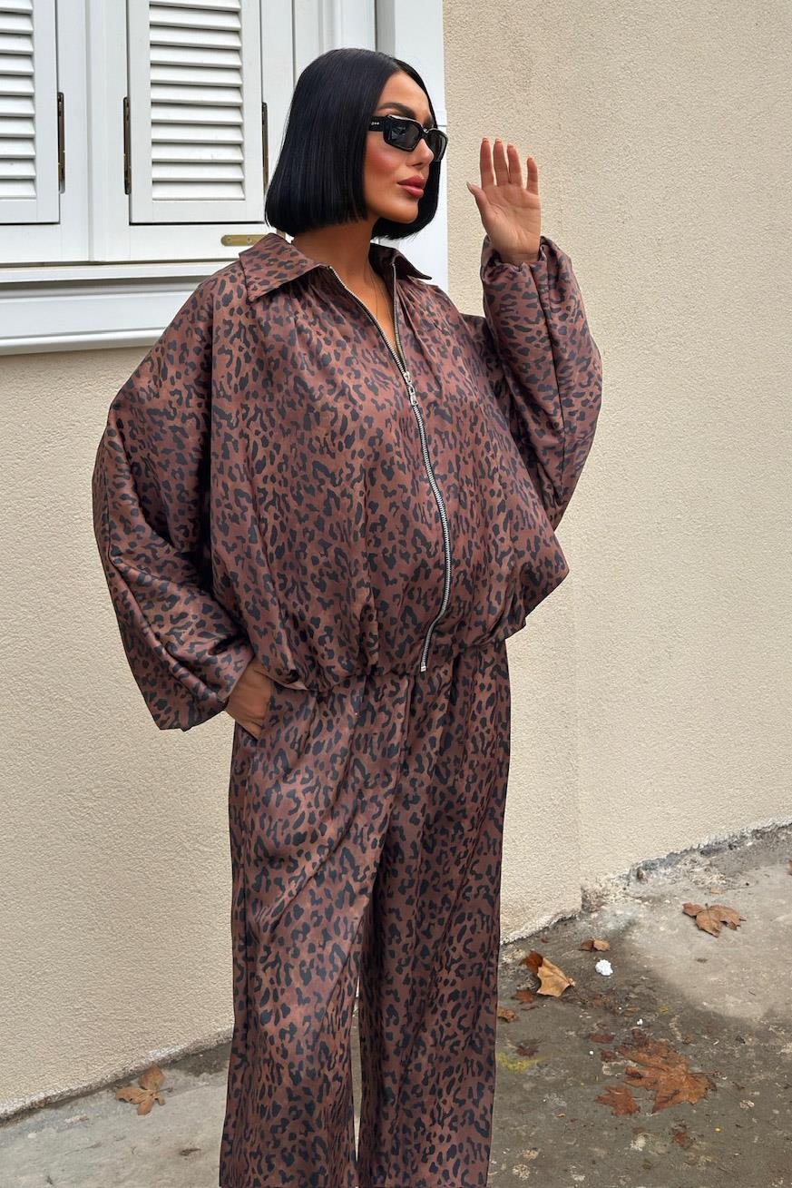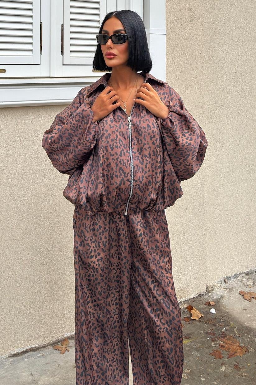 Bomber Ceket ve Şalvar Pantolonlu Leopar Desen Saten Takım 10276 (S6K10276)
