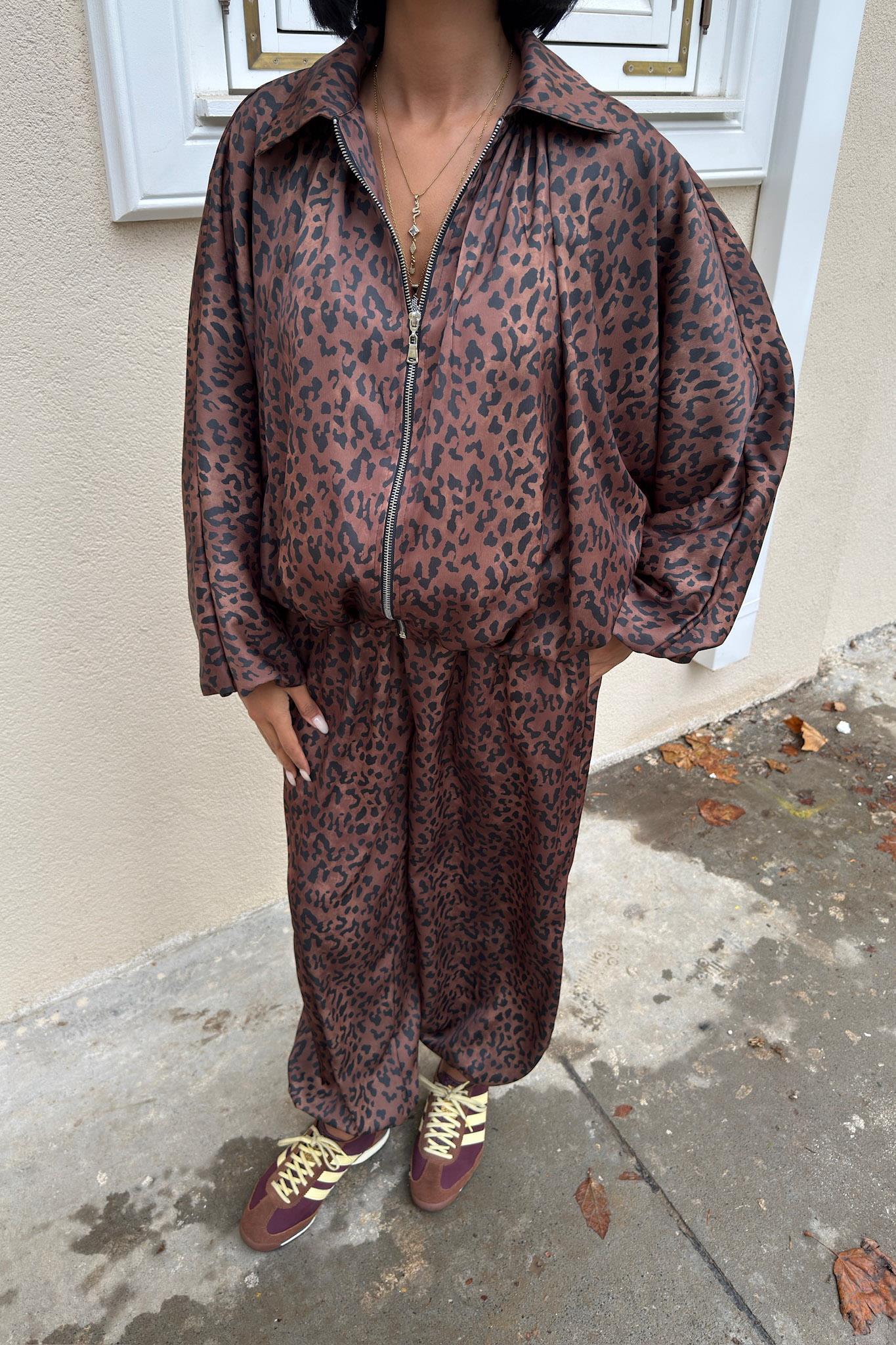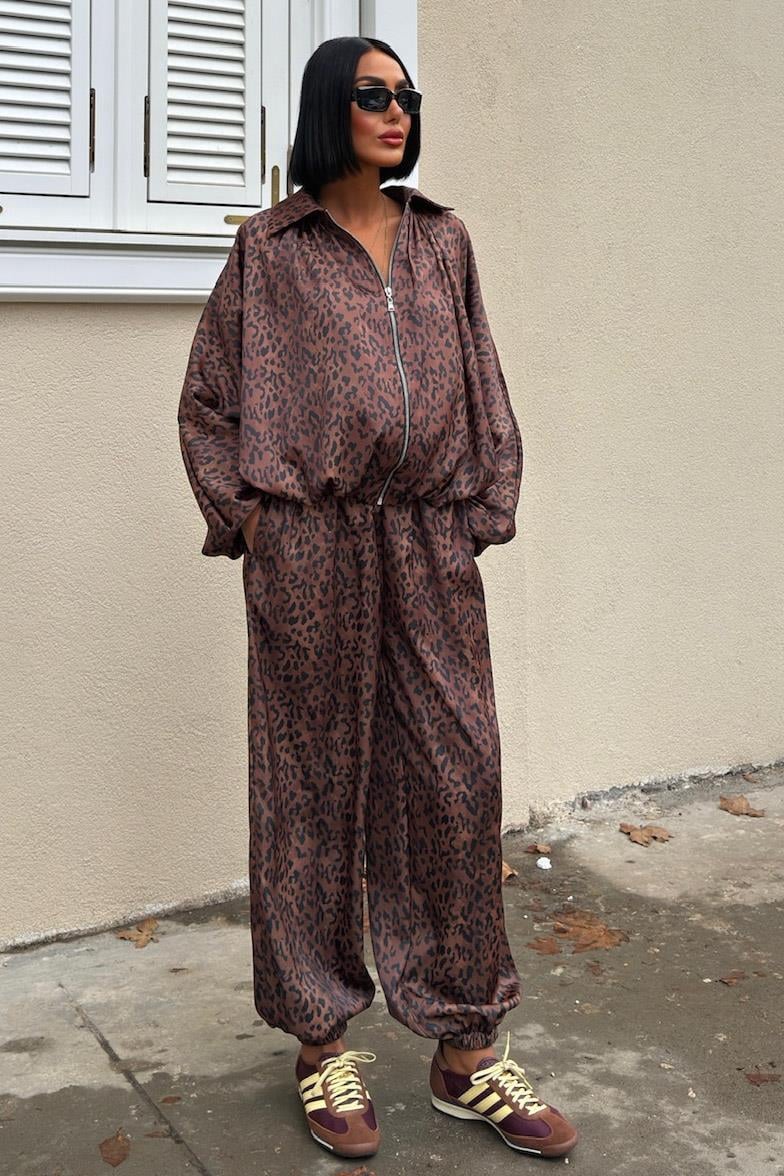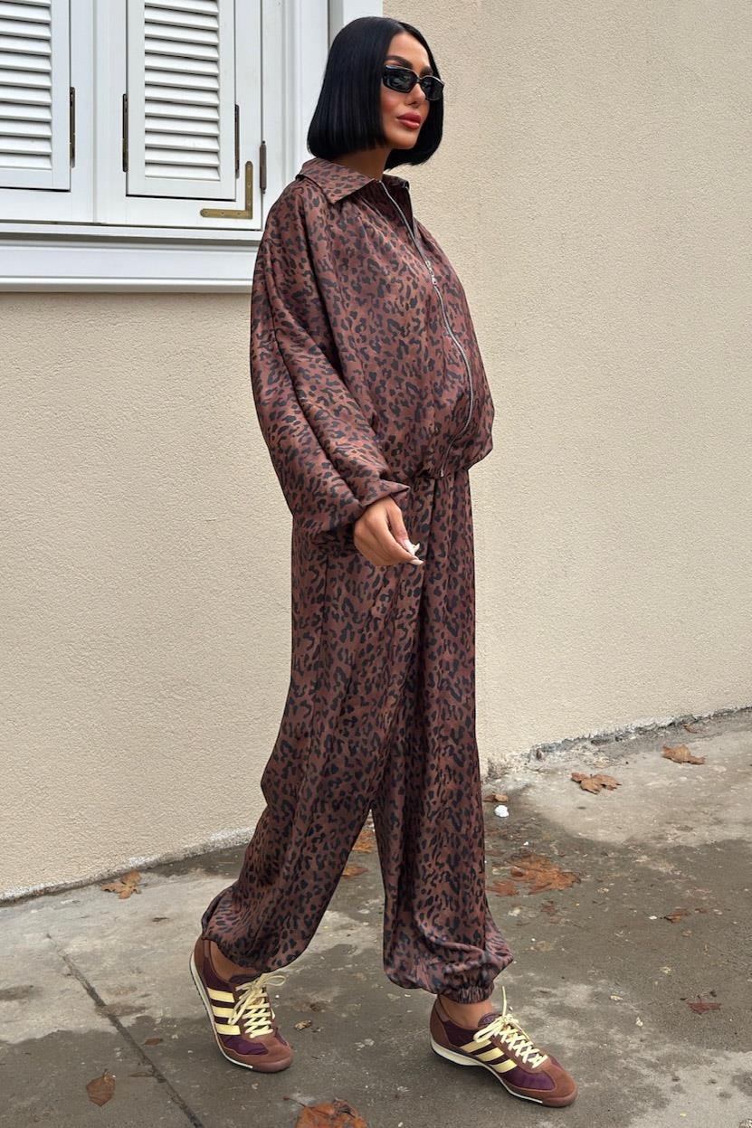 Bomber Ceket ve Şalvar Pantolonlu Leopar Desen Saten Takım 10276 (S6K10276)