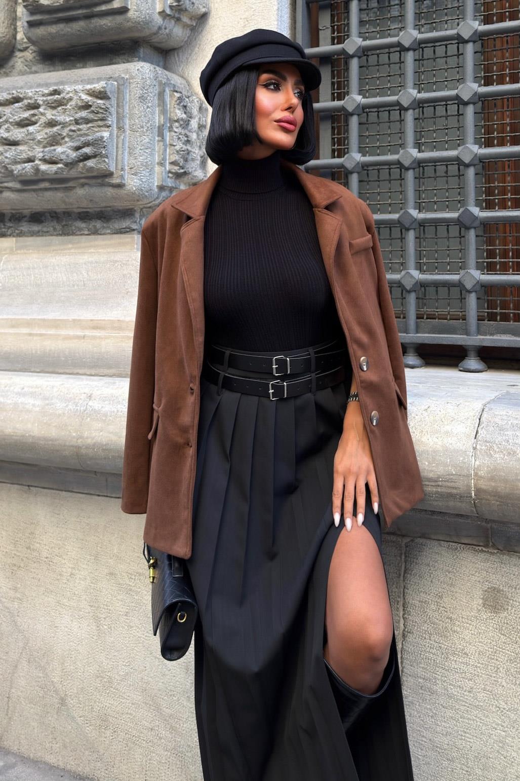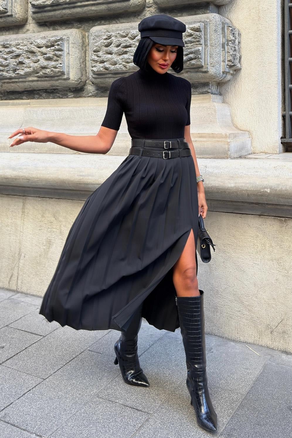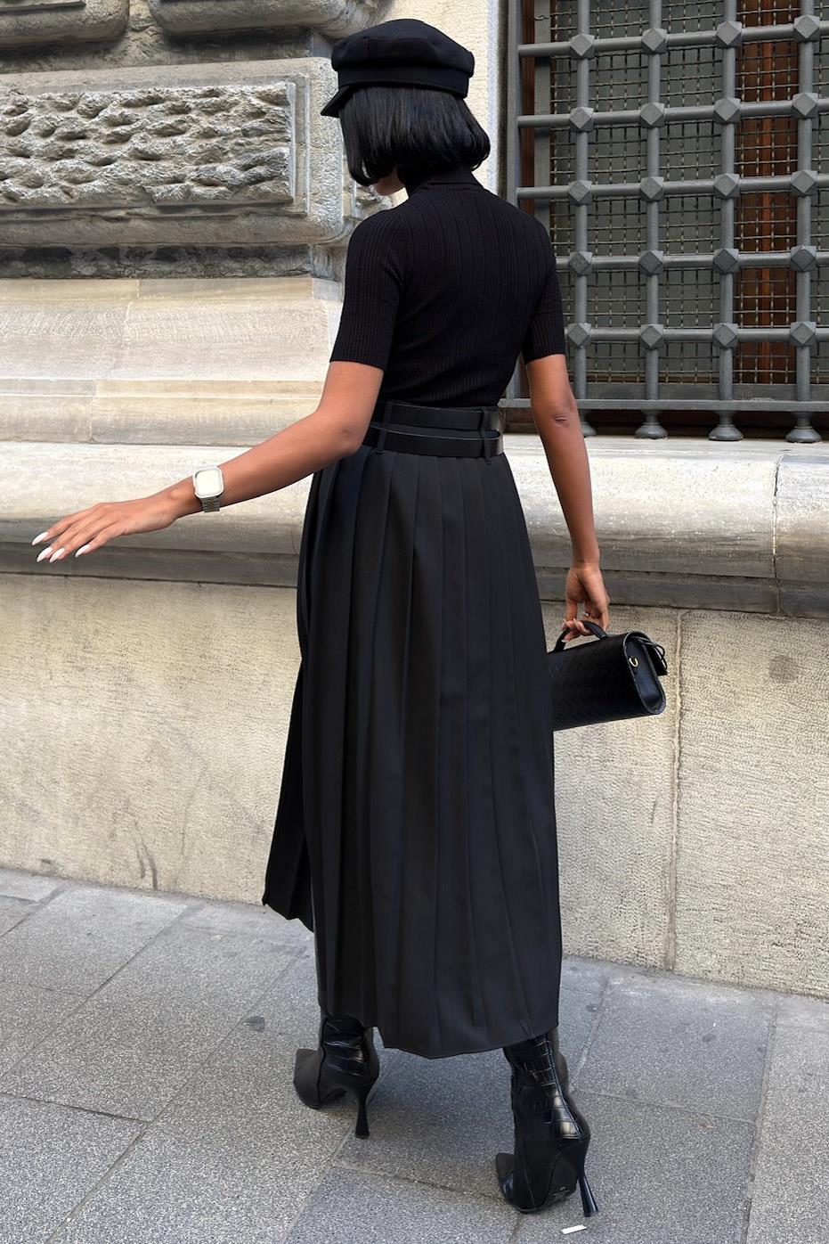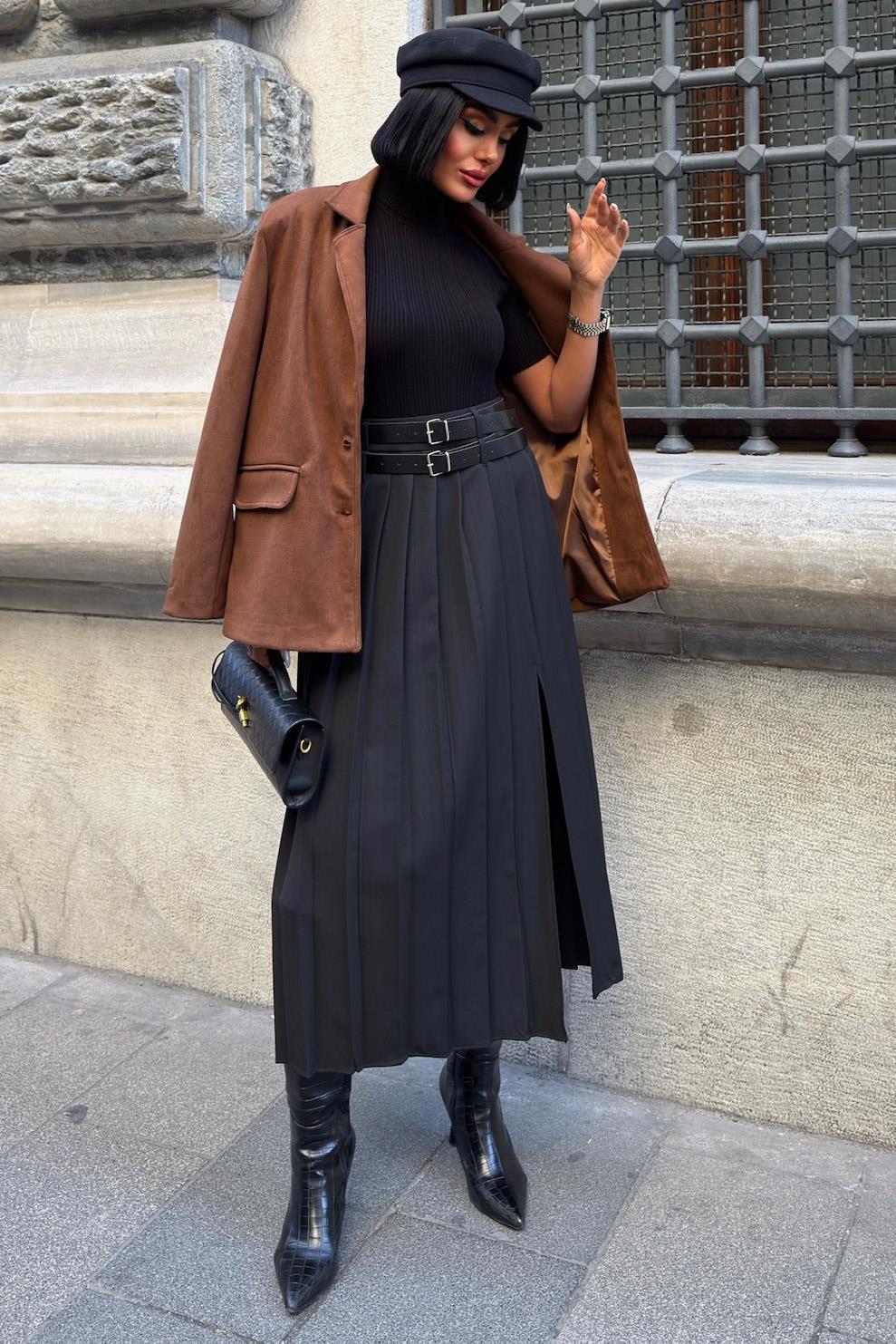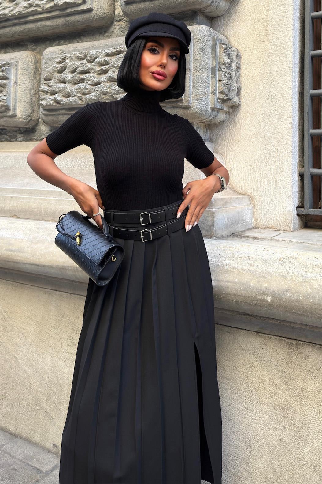 Çift Kemer Detaylı ve Yırtmaçlı Pileli Etek 4055 (S6K4055)